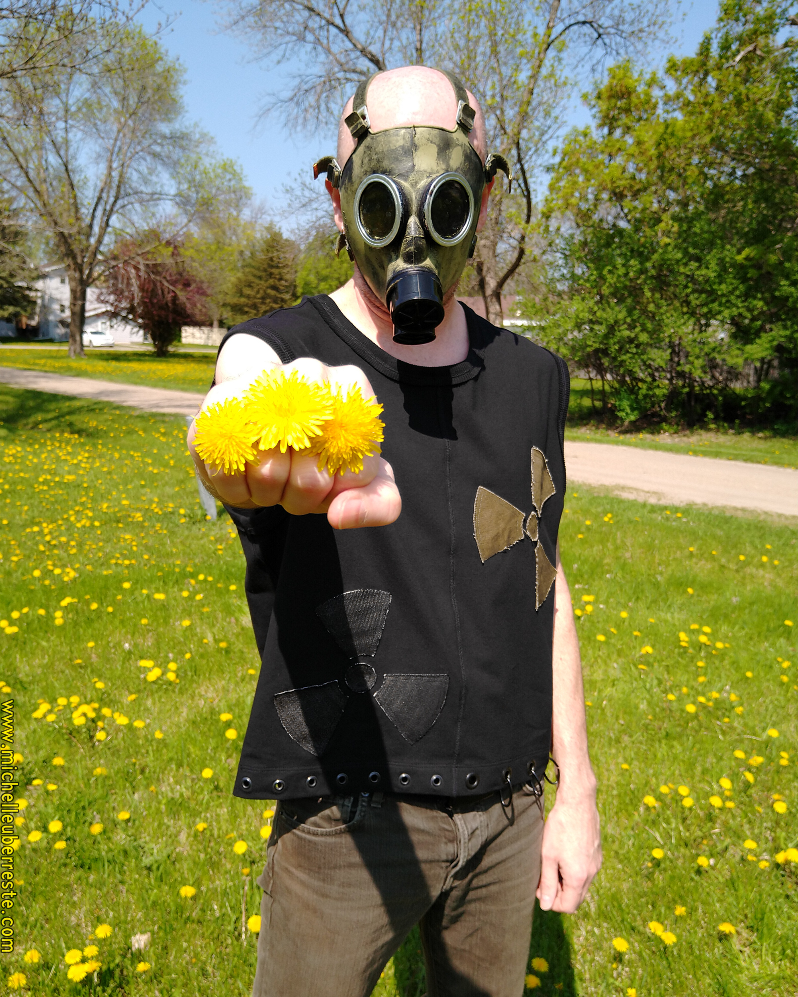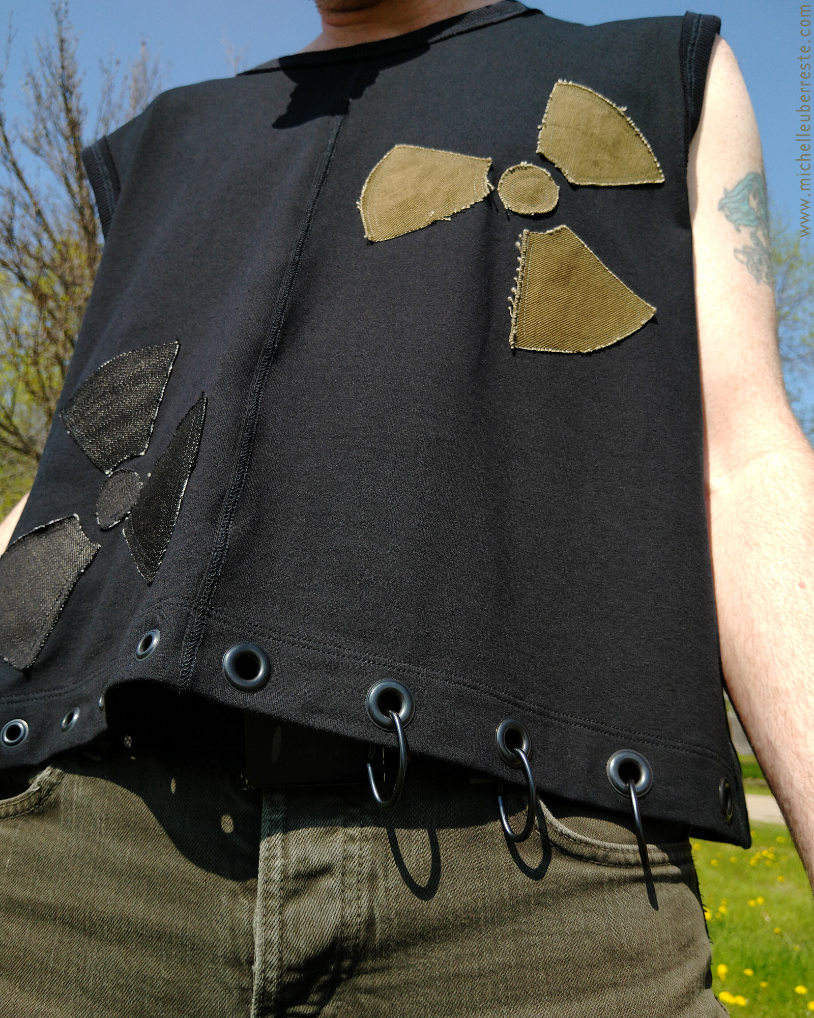 Oversized muscle tee made from thick cotton lycra (much thicker than a regular t-shirt!) with raw edge ribbed binding, reverse coverstitch detail, and radioactive symbols on the front in olive and black denim. The olive green denim is a sample cut I got from a company that was going out of business. The black is from a small roll of fabric I picked up in the L.A. fabric district years ago, leftover from a corporate order, no doubt. The hem is trimmed with black metal grommets and 3 industrial chain links. Only 2 in existence so far...