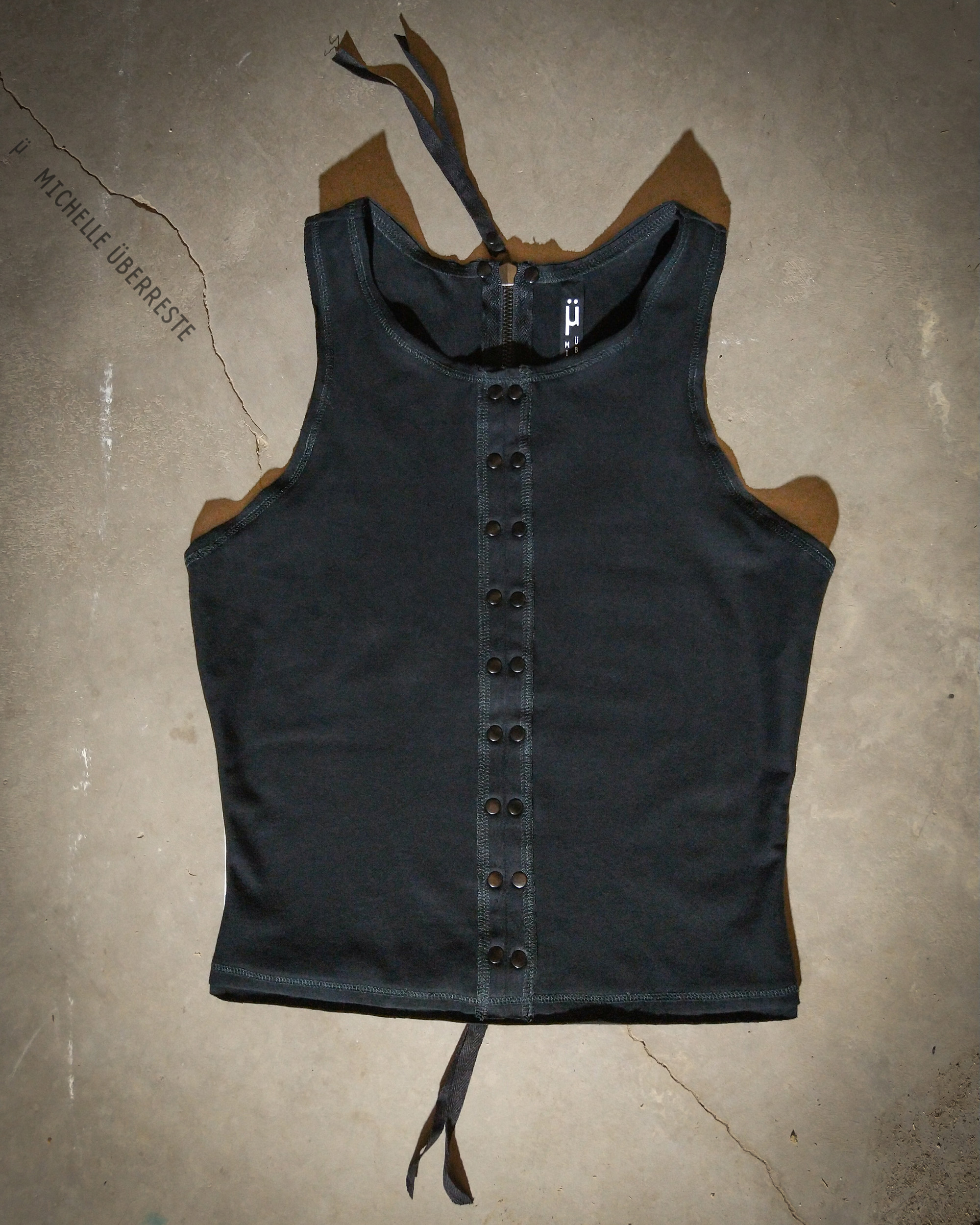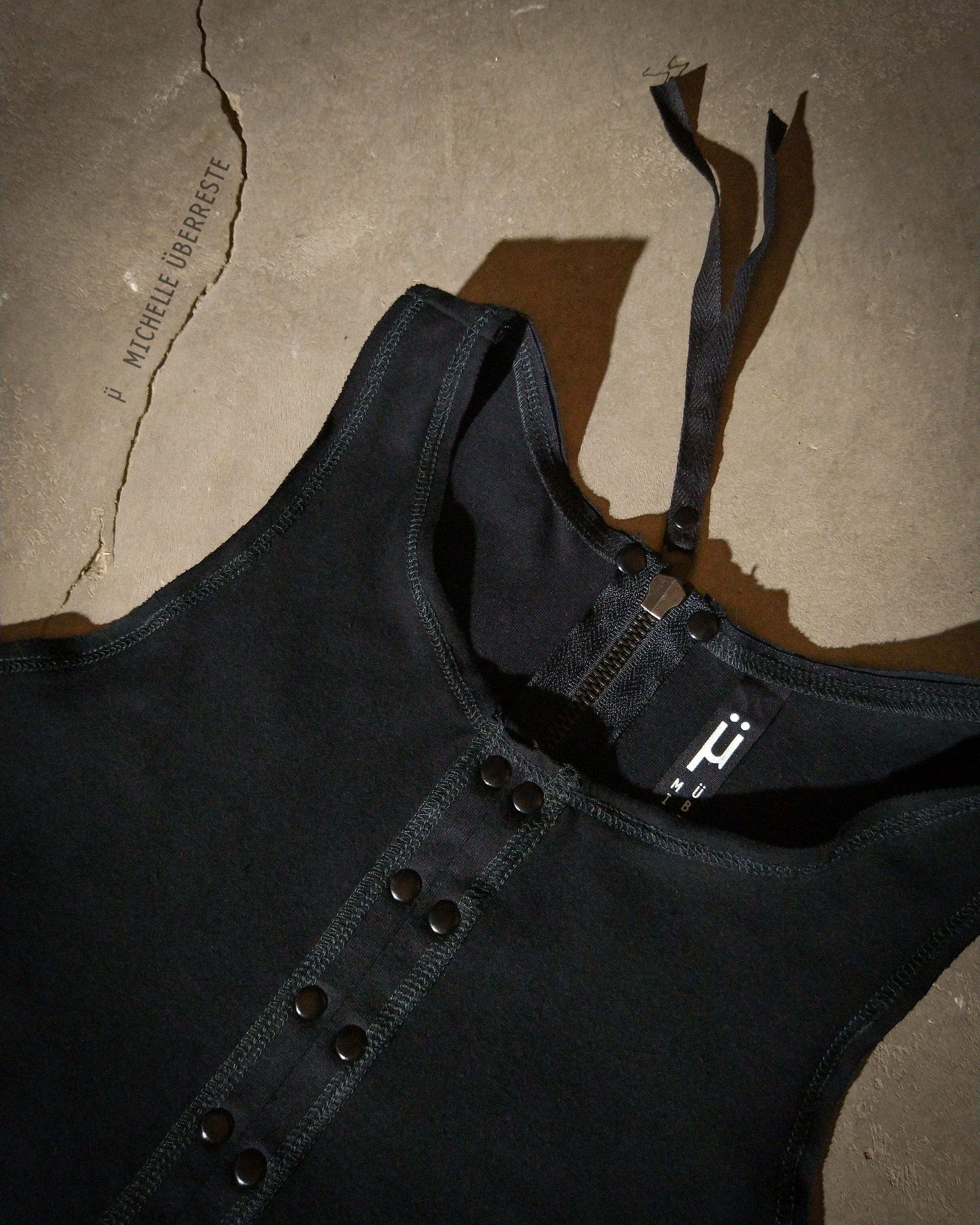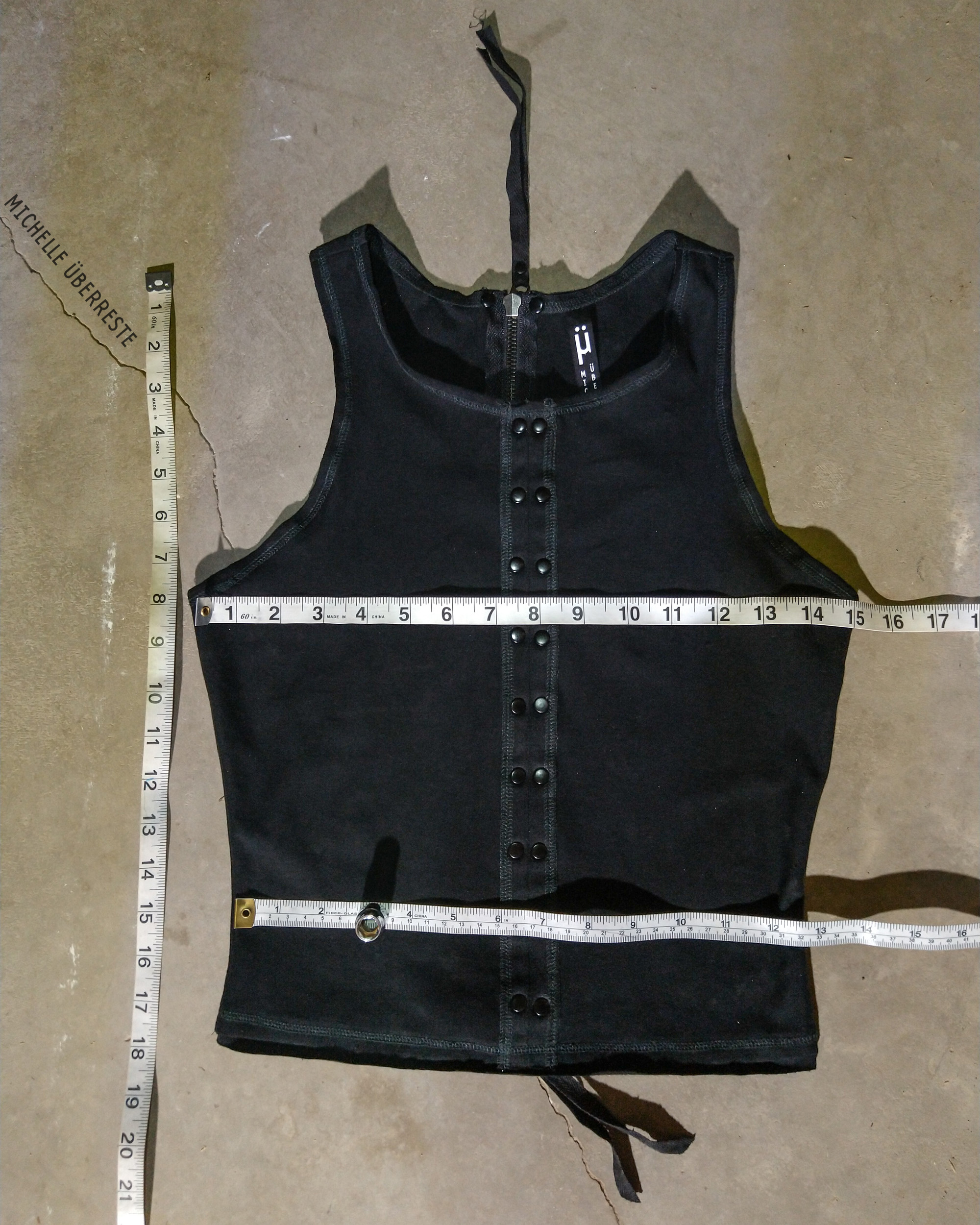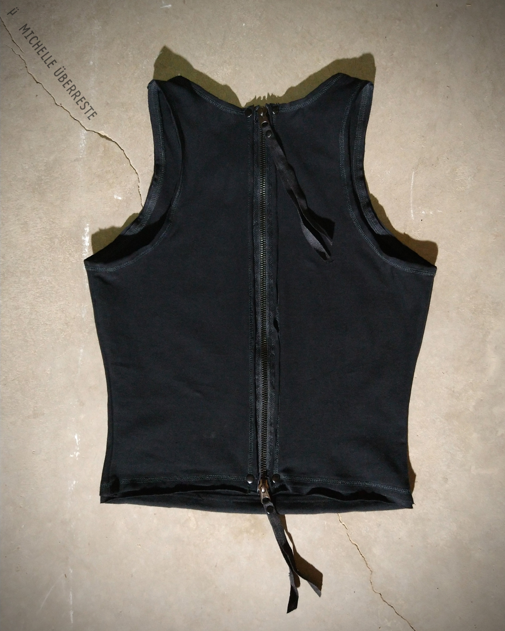 ONE OF A KIND black cotton lycra tank top with reverse coverstitch detail, super flat raw edge seams, and a double row of black rivets going up the front. Exposed metal zipper in the back with double head and studded pulls made from cotton twill tape. Flattering racerback design. One of a kind for now, but I do love this design and may bring it back in the future.