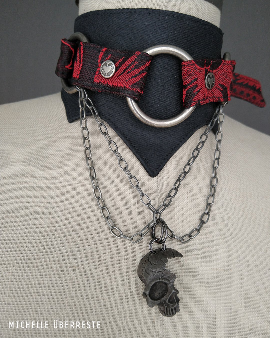 One of a kind collar made from black + red tapestry fabric with black antique nickel hardware, and batwing shaped back piece. Decayed skull charm dangles from an amalgamation of matching chains that hang from 3 O-rings. Buckle closure in the back with grommets + rivets. Super adjustable, see last photo for measurements.