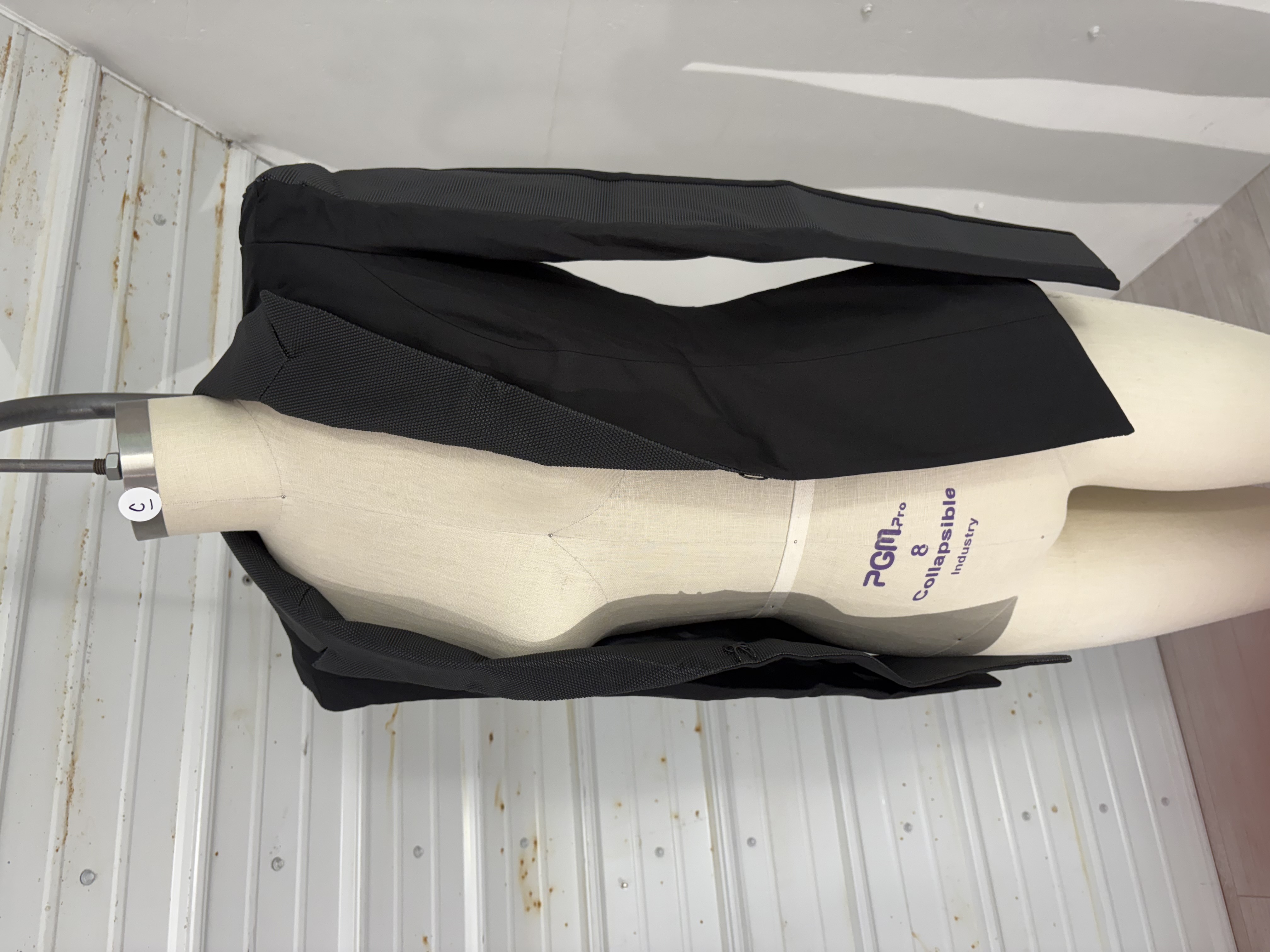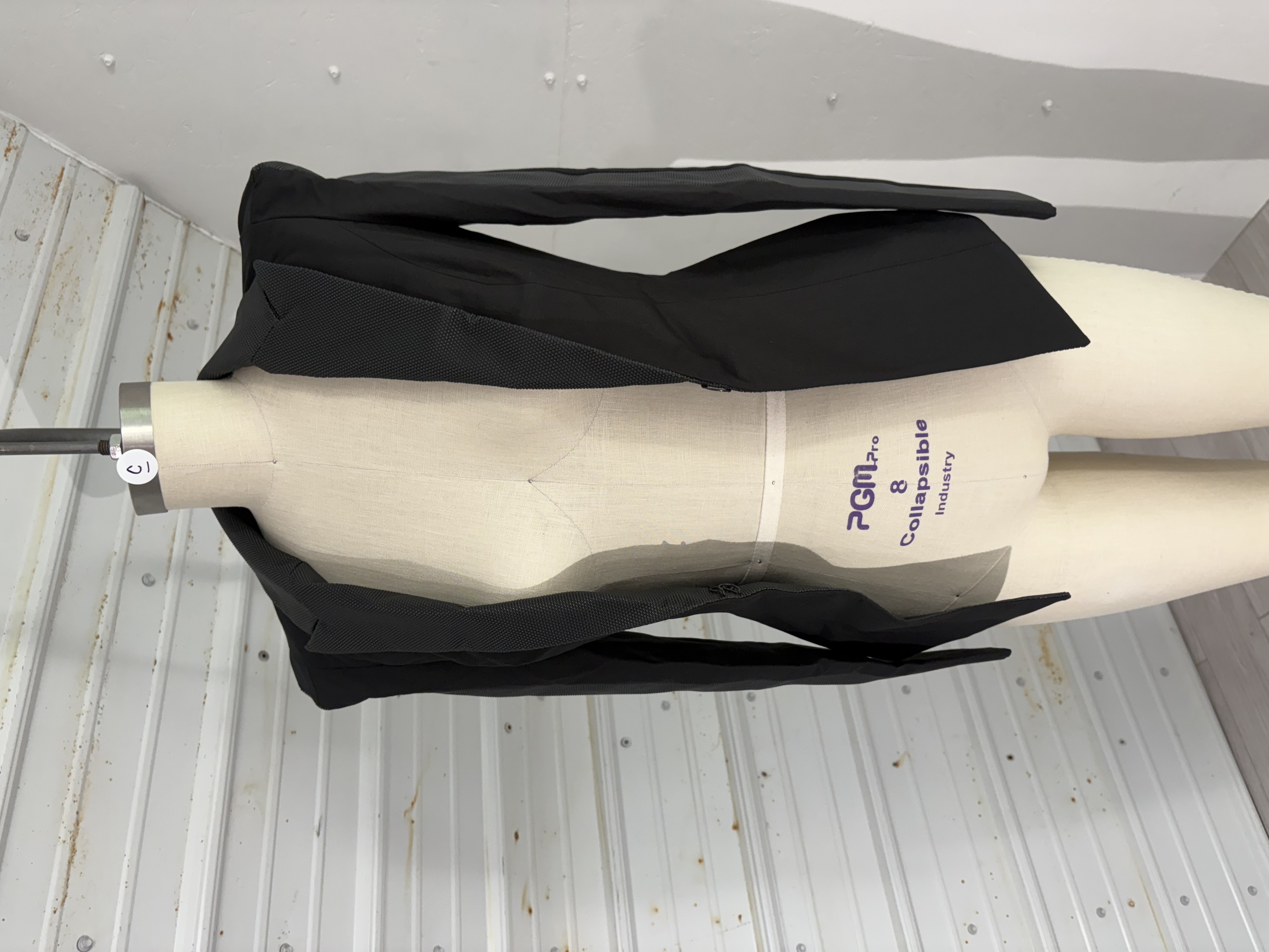 Black blazer with hexagonal textured rubber contrast lapels and sleeve insert. The sleeve caps are built up and out in a geometric shape. Fully lined.