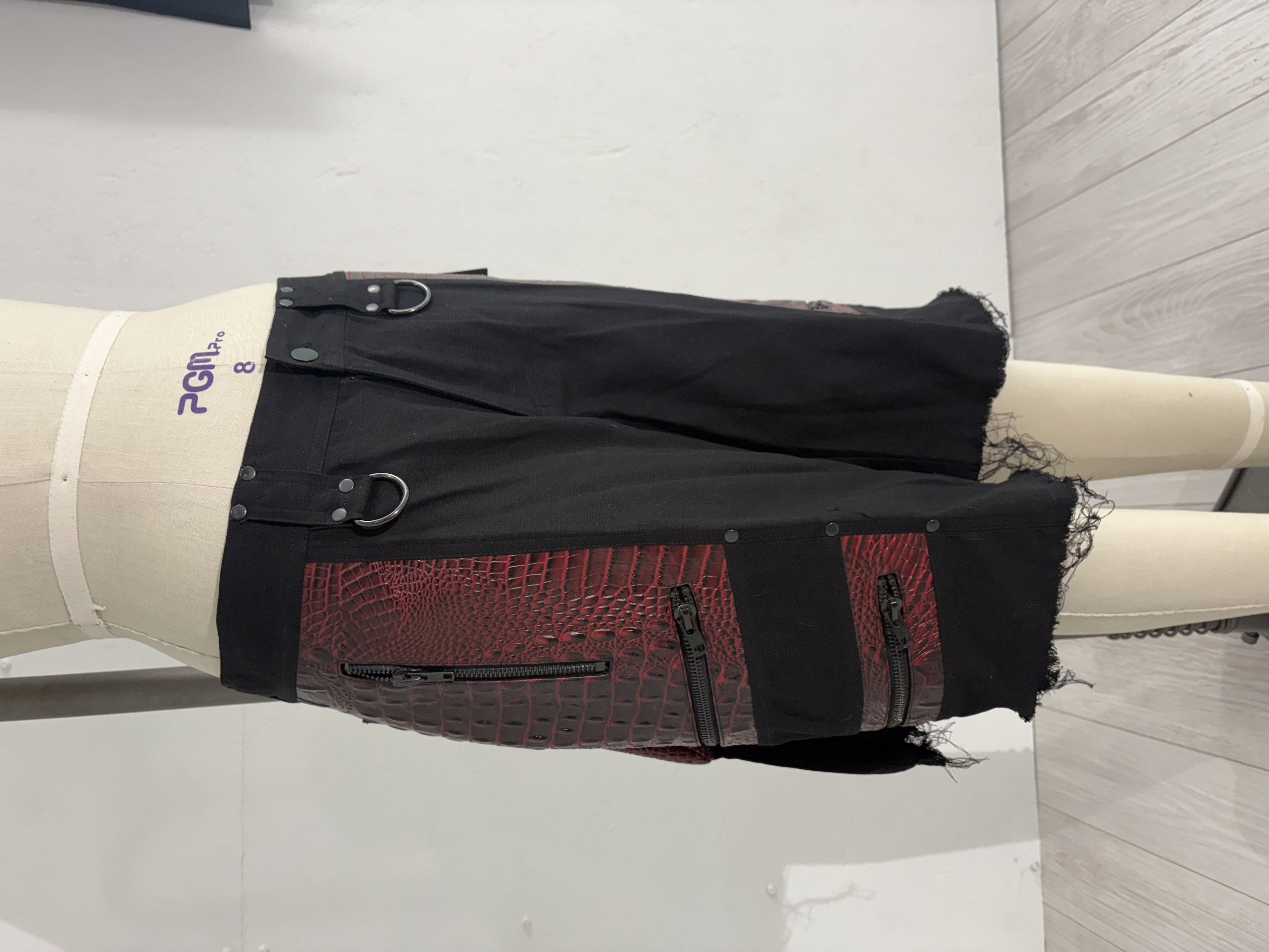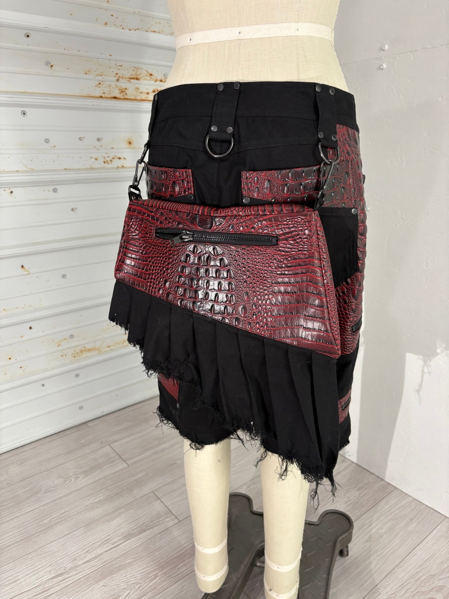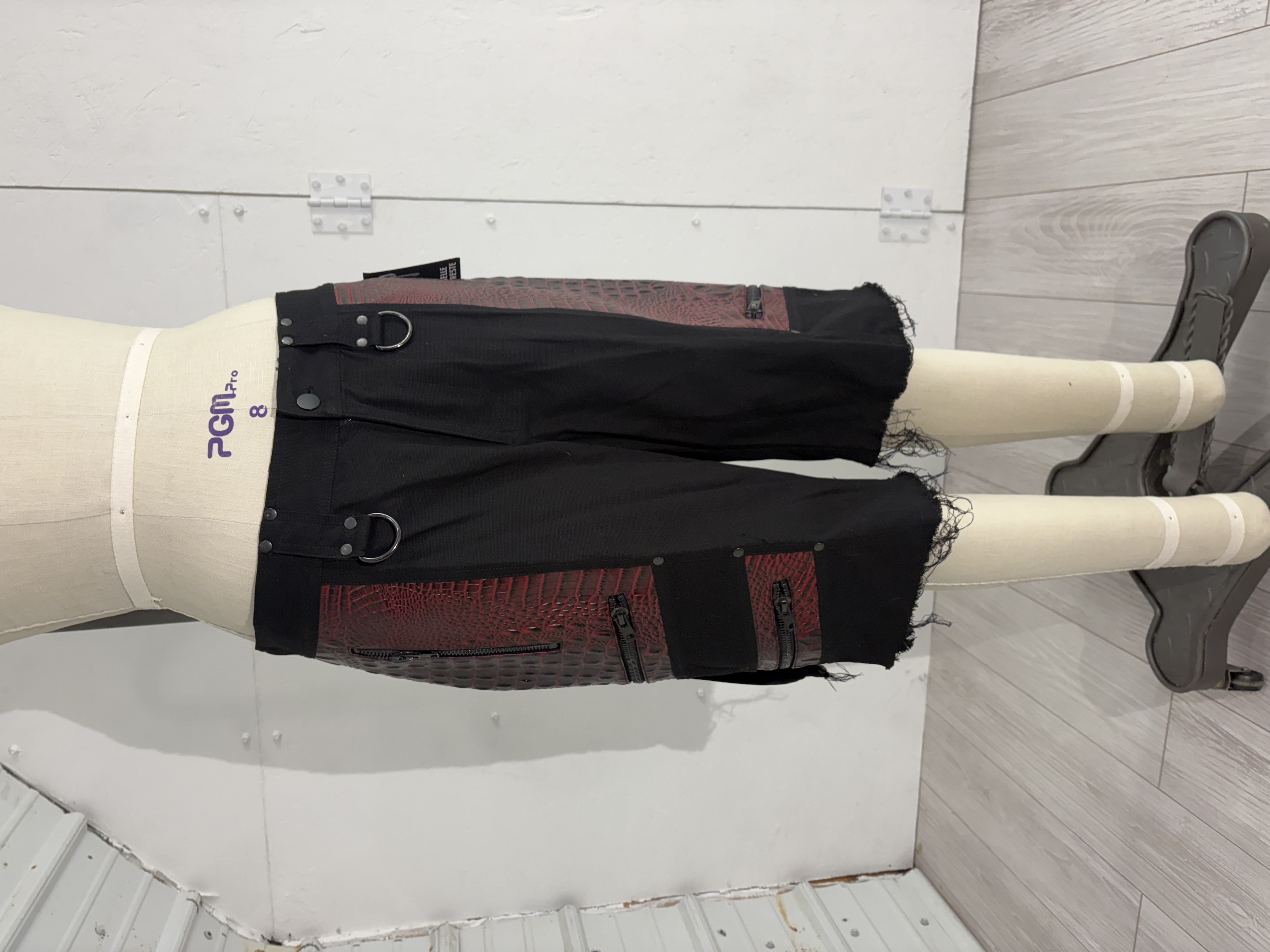 Black stretch canvas men's bondage shorts with vegan alligator leather contrast, oversize black zippers and removable pleated pocket that can be worn in the back, side, or front. Tons of pockets for storage, and black D-rings and rivets. Hem and pocket are distressed by hand. Comes with matching sleeves with inside red lining, raw edge armhole edges.