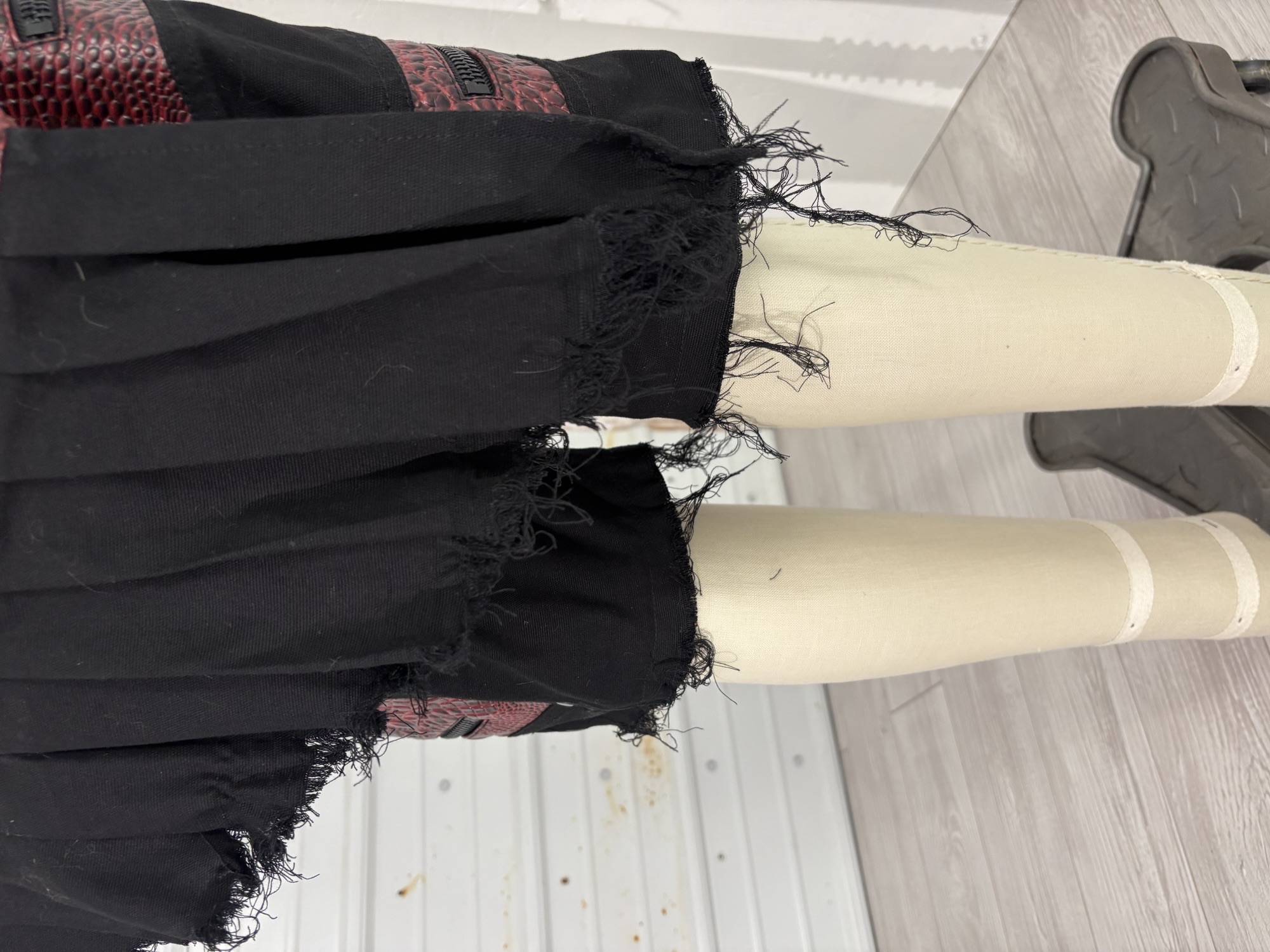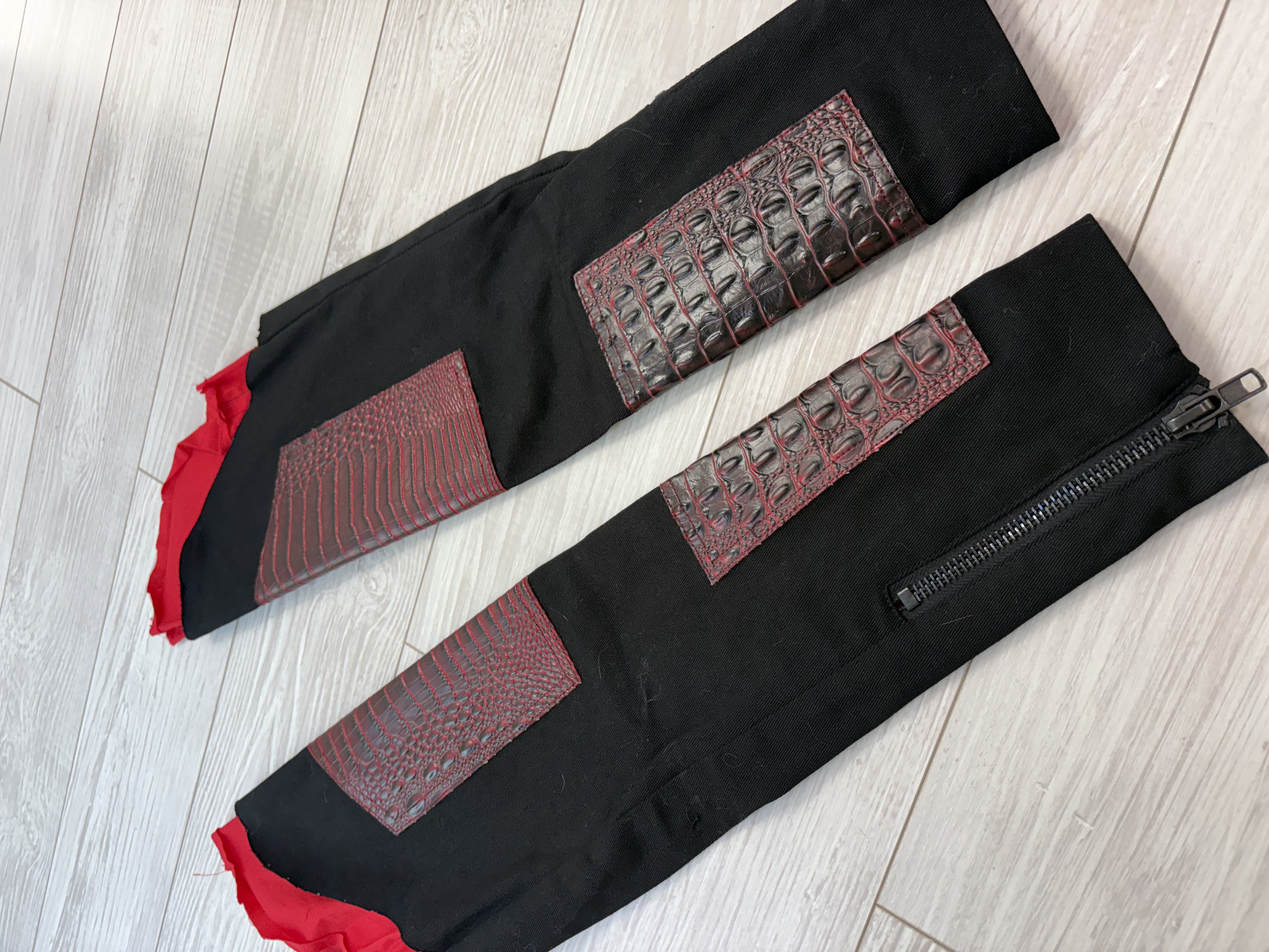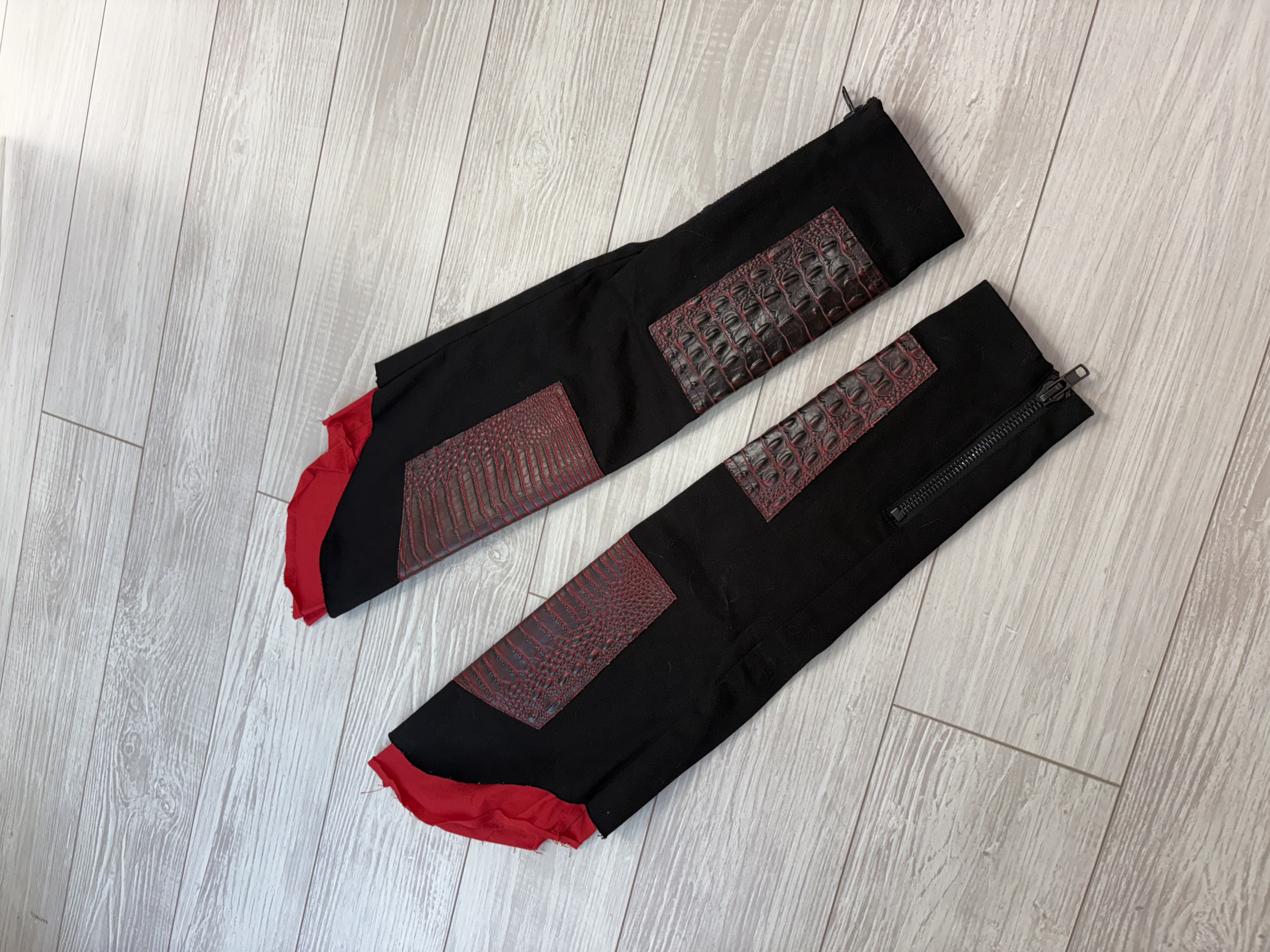 Black stretch canvas men's bondage shorts with vegan alligator leather contrast, oversize black zippers and removable pleated pocket that can be worn in the back, side, or front. Tons of pockets for storage, and black D-rings and rivets. Hem and pocket are distressed by hand. Comes with matching sleeves with inside red lining, raw edge armhole edges.