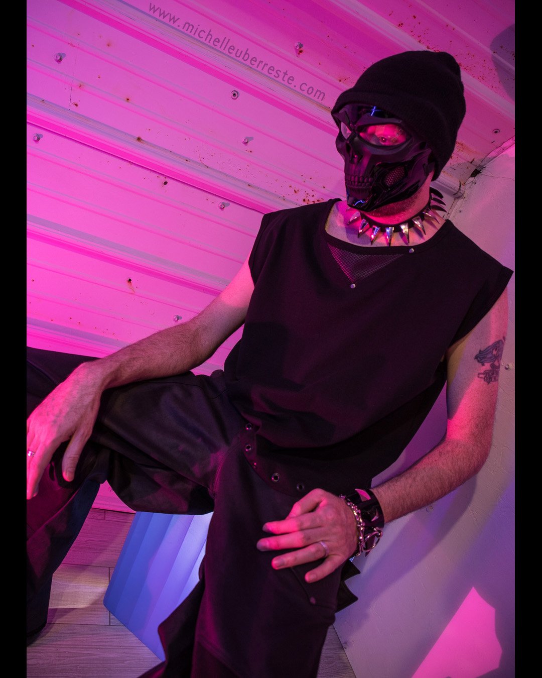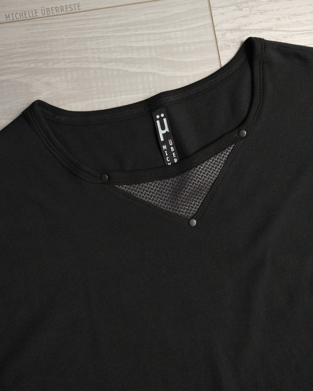 One of a kind oversized muscle tee made from cotton lycra with raw edge ribbed binding, reverse coverstitch detail, and embossed contrast fabric at the center front neck, with rivets. The wide hem is trimmed with black metal grommets.