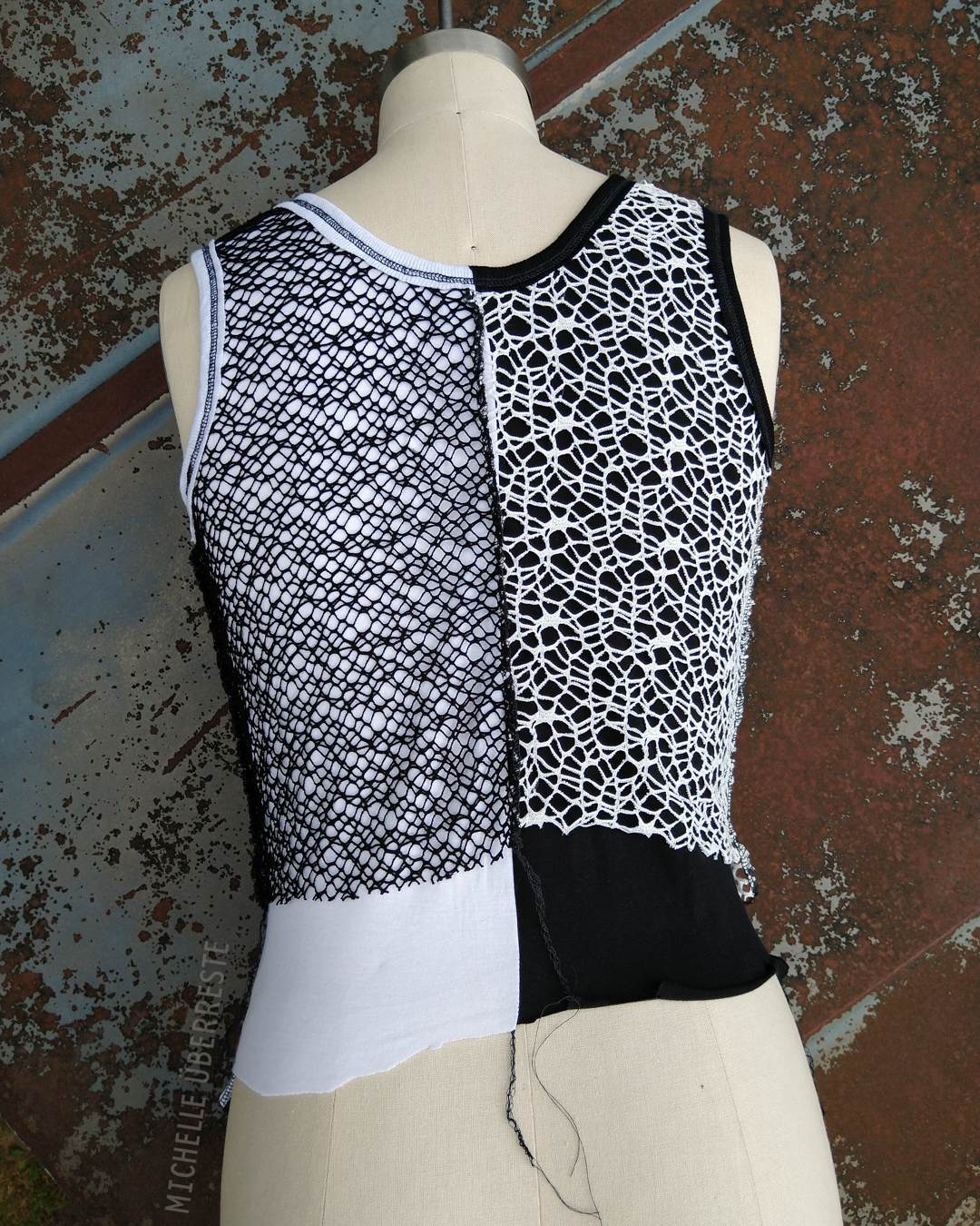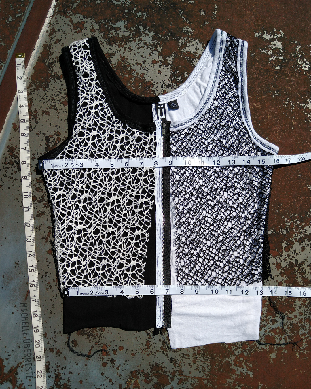 One of a kind tank top made entirely from scraps! Leftover fabrics like stretchy cotton lycra underneath nylon webbing, with raw ribbed binding in black + white. Metal zipper that is silver/white on one side, and black/black on the other! Reversed cover stitch, and tattered hem.