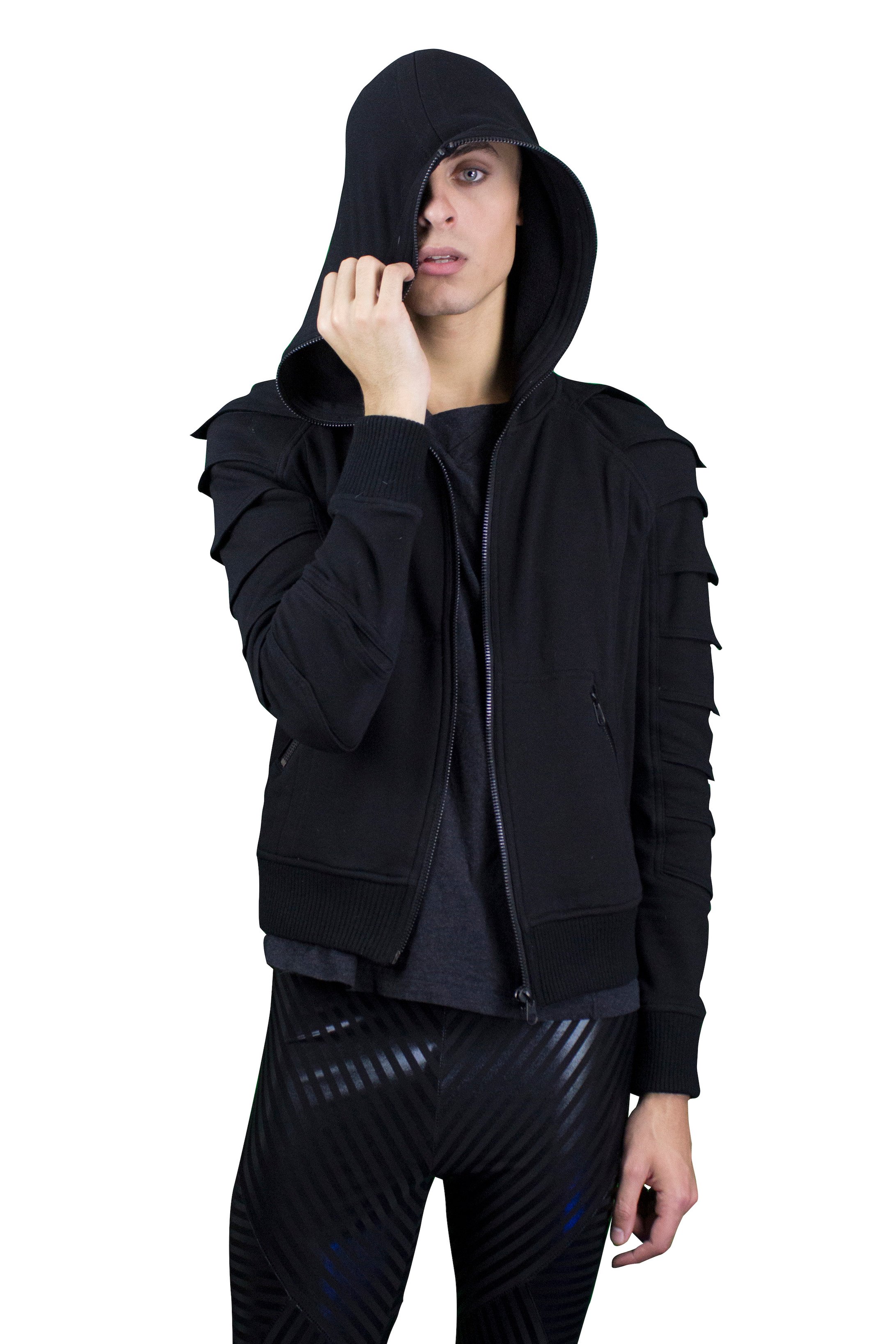 Men's hooded sweatshirt with scaled sleeves, set in zipper pockets, and front zipper that extends all the way to the top of the hood. Made from black french terry with rib contrast.